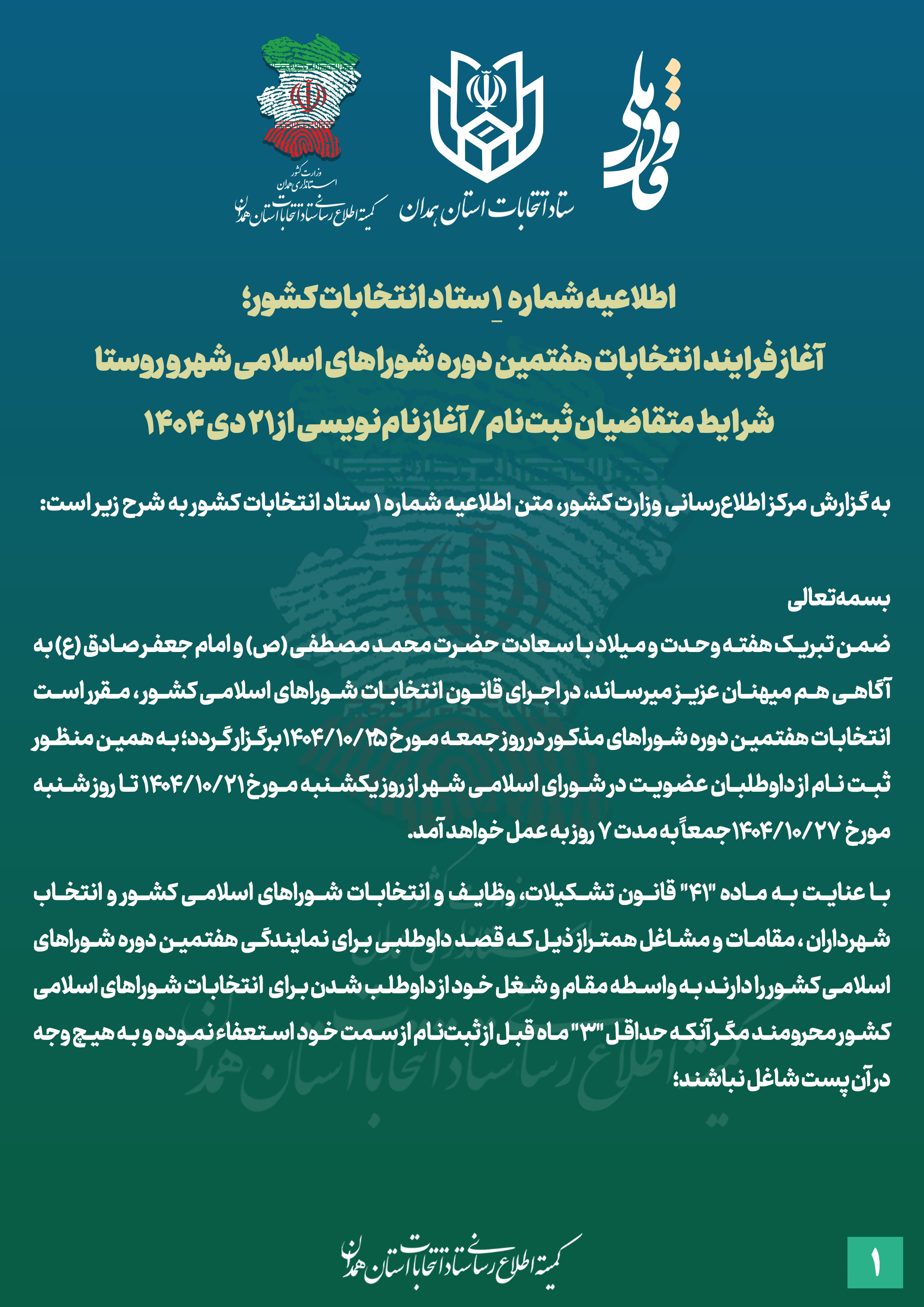 23 شهریور 1404 بازدید: 362 اطلاعیه شماره ۱ ستادانتخابات کشور؛ آغاز فرایند انتخابات هفتمین دوره شوراهای اسلامی شهر و روستا