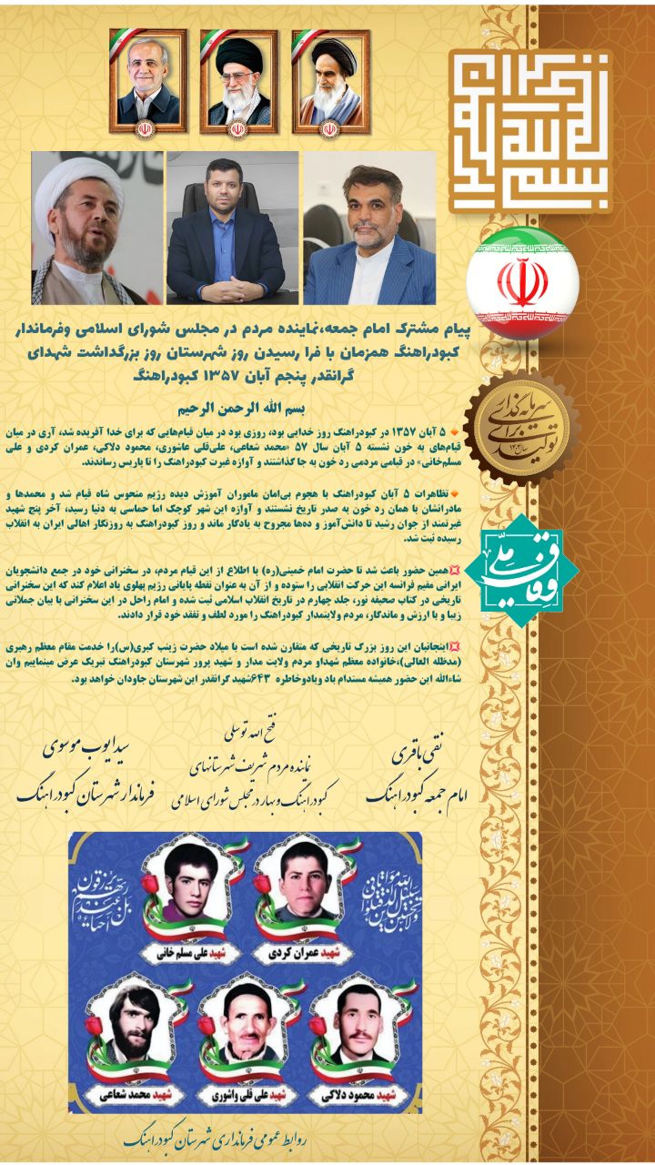 پیام مشترک امام جمعه،نماینده مردم در مجلس شورای اسلامی وفرماندار کبودراهنگ همزمان با فرا رسیدن روز شهرستان روز بزرگداشت شهدای گرانقدر پنجم آبان ۱۳۵۷ کبودراهنگ