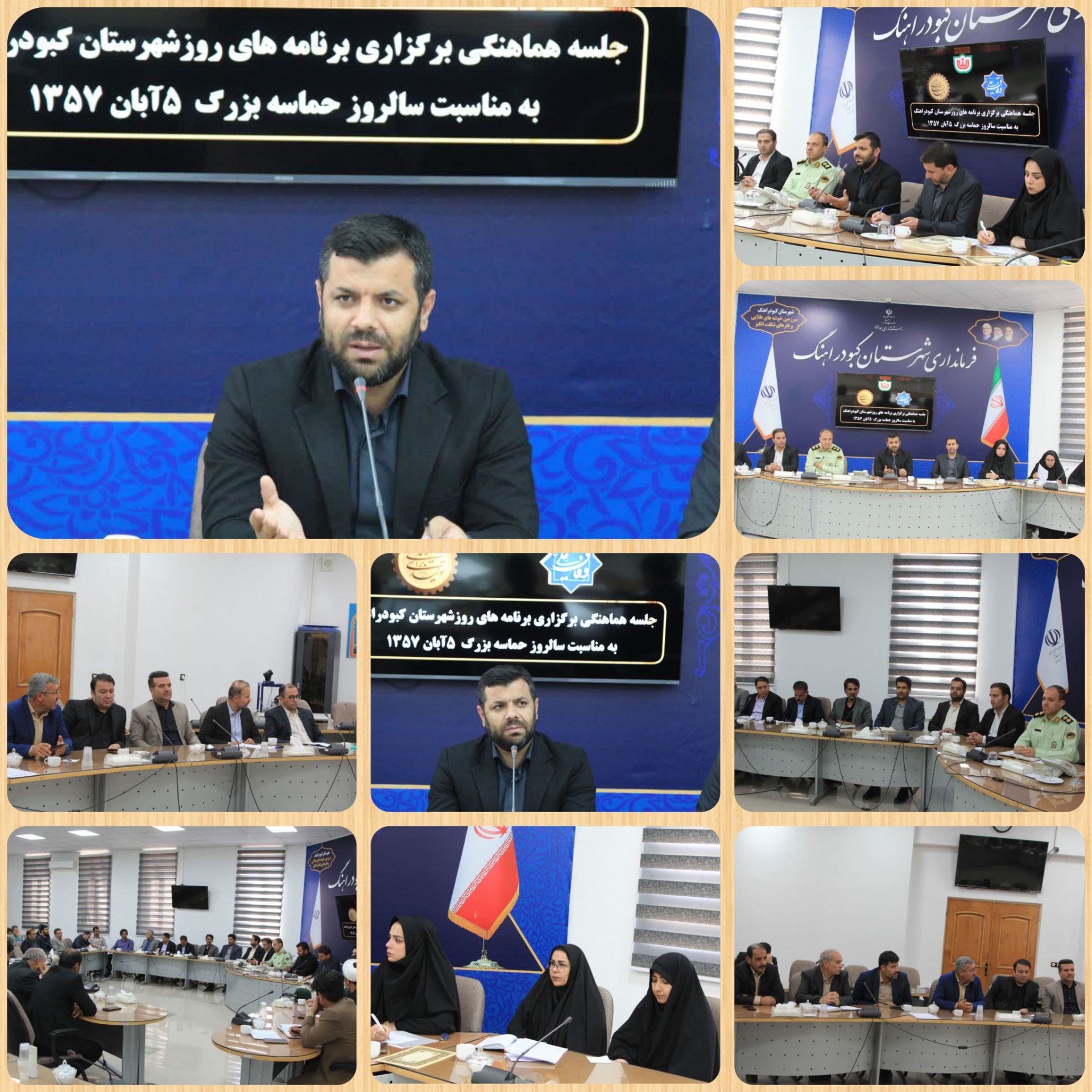 ✅️سومین جلسه هماهنگی برگزاری برنامه های روز شهرستان کبودراهنگ به مناسبت سالروز حماسه بزرگ ۵آبان ۱۳۵۷ برگزار گردید.