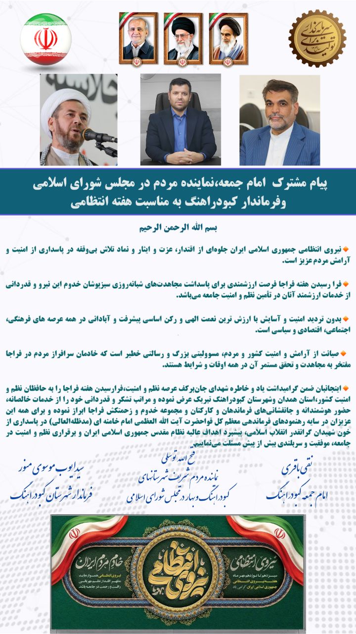 ✅پیام مشترک ️امام جمعه،نماینده مردم در مجلس شورای اسلامی وفرماندار کبودراهنگ به مناسبت هفته انتظامی