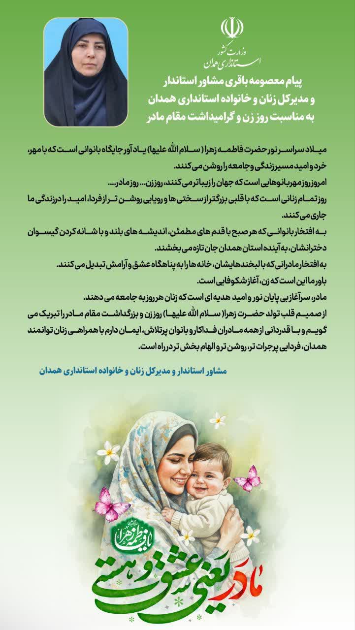 23 آذر 1404 بازدید: 39 پیام مشاور استاندار و مدیر کل امور زنان و خانواده به مناسبت میلاد حضرت زهرا (س) و روز مادر